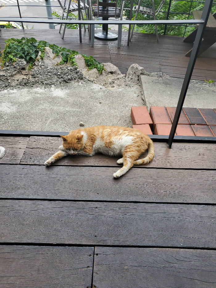 지하로 내려가면 야외 테이블도 있는데요, 치즈 냥이도 두 마리가 있어요.